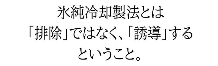 氷屋の技術を応用した特別な一方向冷却構造により、氷は上から下へとゆっくりと凍結。不純物や気泡は、最後に凍る最下部へ自然と押し出されていきます。