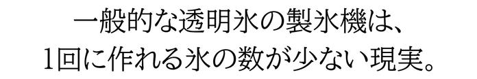 - 一般的な透明氷の製氷機は、1回に作れる氷の数が少なく、たいてい1個ずつしか製氷できません。そのため、次の一杯を楽しむまでに時間がかかってしまったり、何度も製氷作業を繰り返す手間が発生したりと、使い勝手に課題が残るのが現実です。